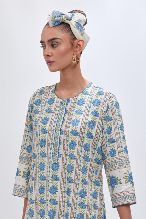Off white cotton straight kurta set with all-over blue & green floral hand block printed.
