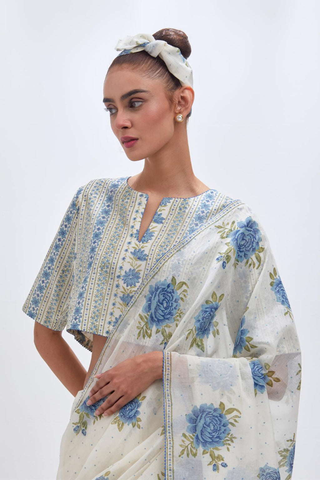 Off-white cotton blouse with all-over blue & green hand block print. It has a round neck with a slit in the front. The edges of sleeves, neck, side slits and hem are finished with ricrac.