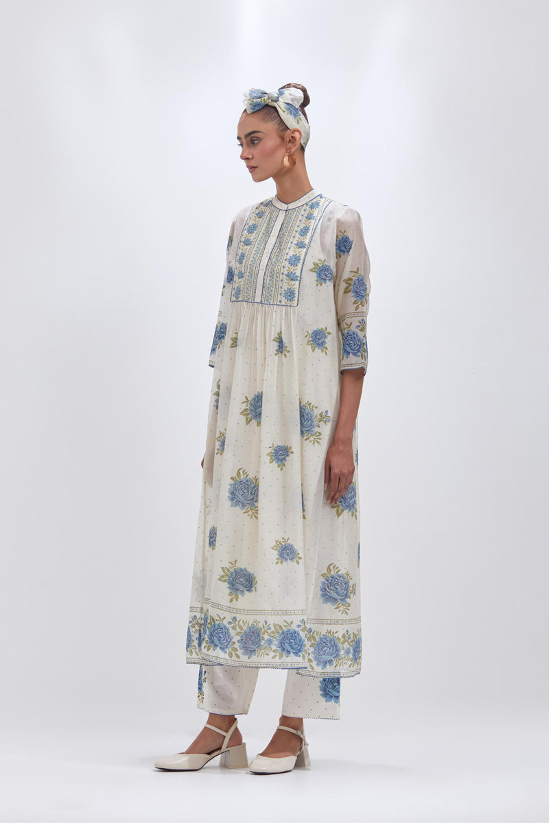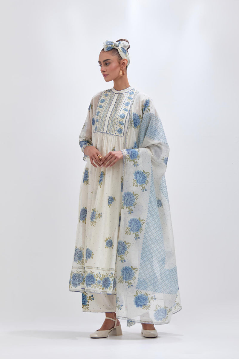Off white kurta dress with all-over blue & green floral hand block print. It has a band collar neck with placket and yoke with fine gathers at front. The edges of 3/4 sleeves, neck, and hem are finished with ricrac. The kurta comes with fine cotton slip. Paired with off white cotton straight pants with all-over blue dots and floral hand block print at sides. It has side pockets and an elasticated waist band with drawstrings in the front for a better fit. Comes with off white cotton Chanderi dupatta with all-over blue & green floral hand block print & fabric tassels at edges. The edges of dupatta are finished with ricrac.