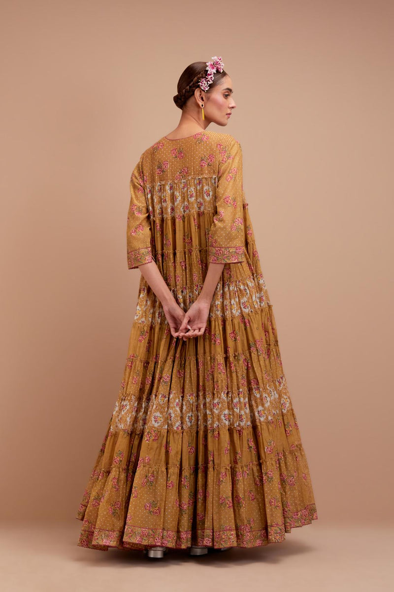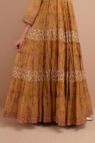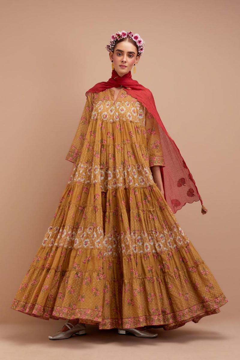 Olive Yellow hand block printed multi-tiered kurta dress with 3/4 sleeves, highlighted with quilted yoke in front and back. It has round neck and slit in the front & 3/4 sleeves. The kurta is finished with the ricrac lace at the edges of neck, sleeves and hem. The kurta comes with fine cotton slip. Paired with Olive Yellow Cotton straight pants with all-over small flower hand block print. It has side pockets and an elasticated waist band with drawstrings in the front for a better fit. Comes with Red Cotton Chanderi dupatta with pink and yellow hand block printed applique, highlighted with scalloped edges. The corners are finished with fabric tassels.